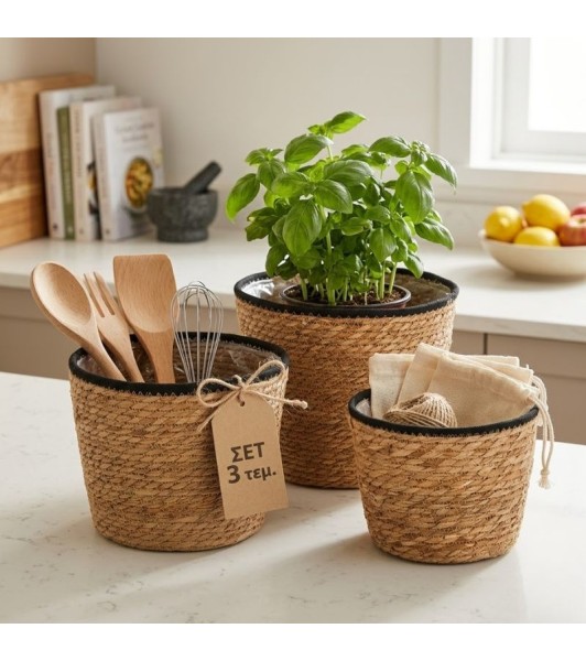 Δώστε μια φυσική και boho πινελιά στη διακόσμησή σας με αυτό το κομψό Σετ 3 Ψάθινων Καλαθιών.